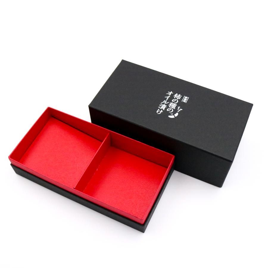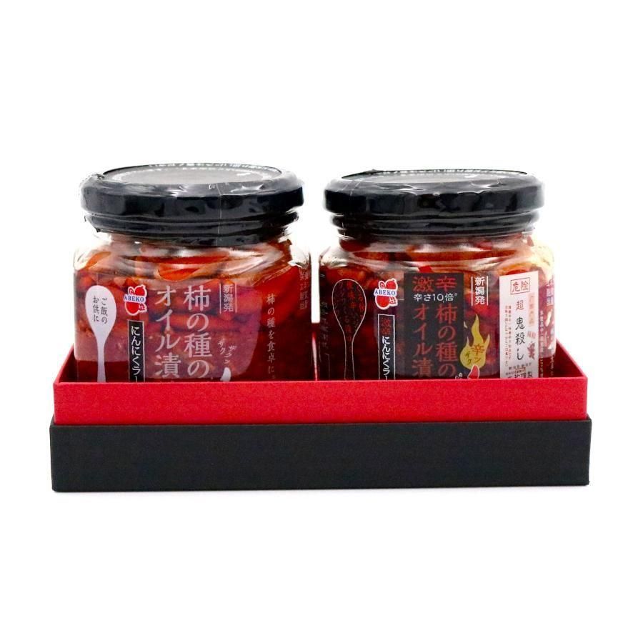 人気の柿の種のオイル漬け激辛にんにくラー油と通常のにんにくラー油を化粧箱に入れてお届けします。大切な方への贈り物に。