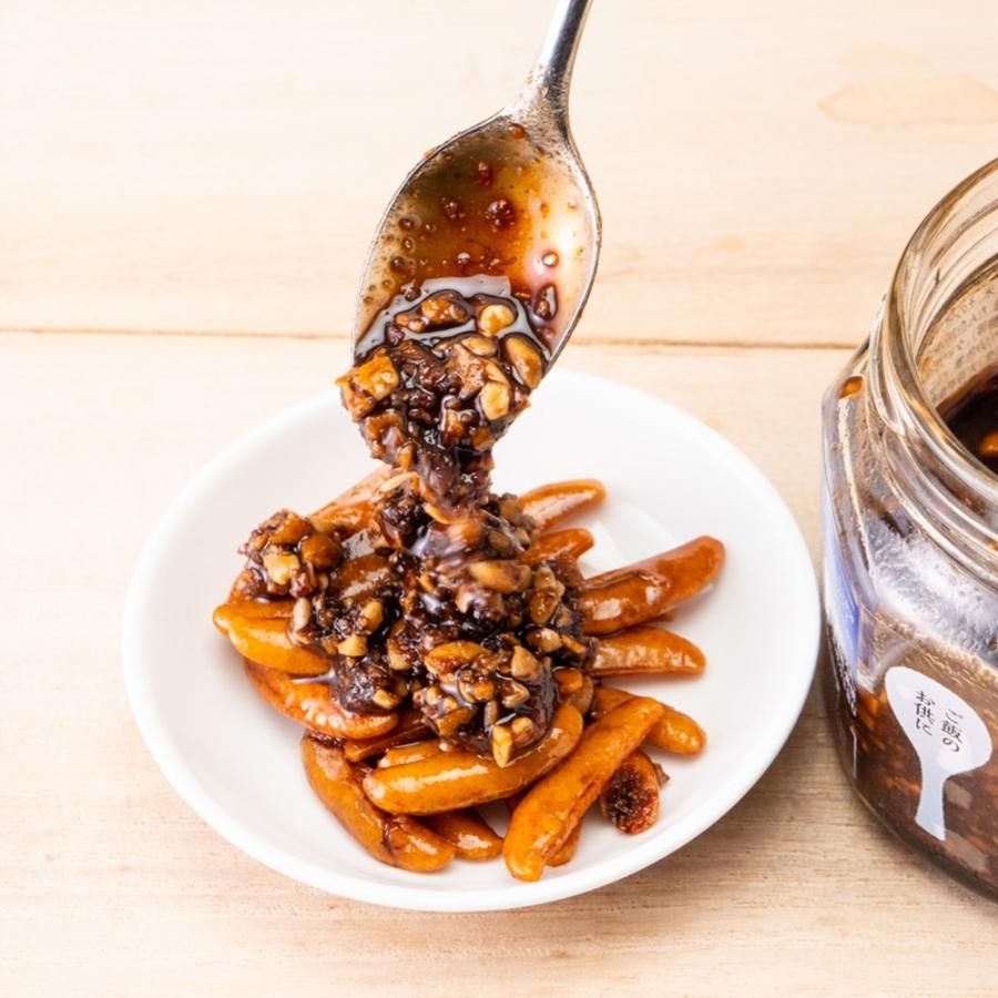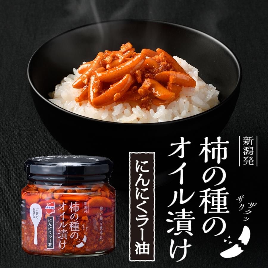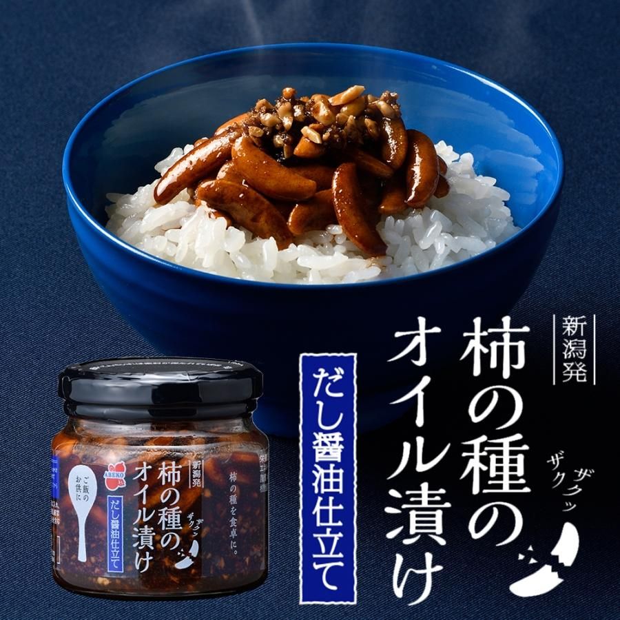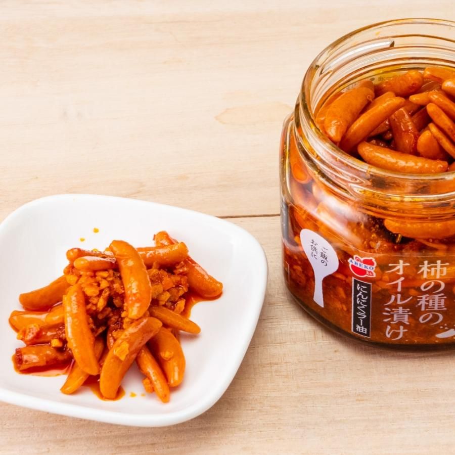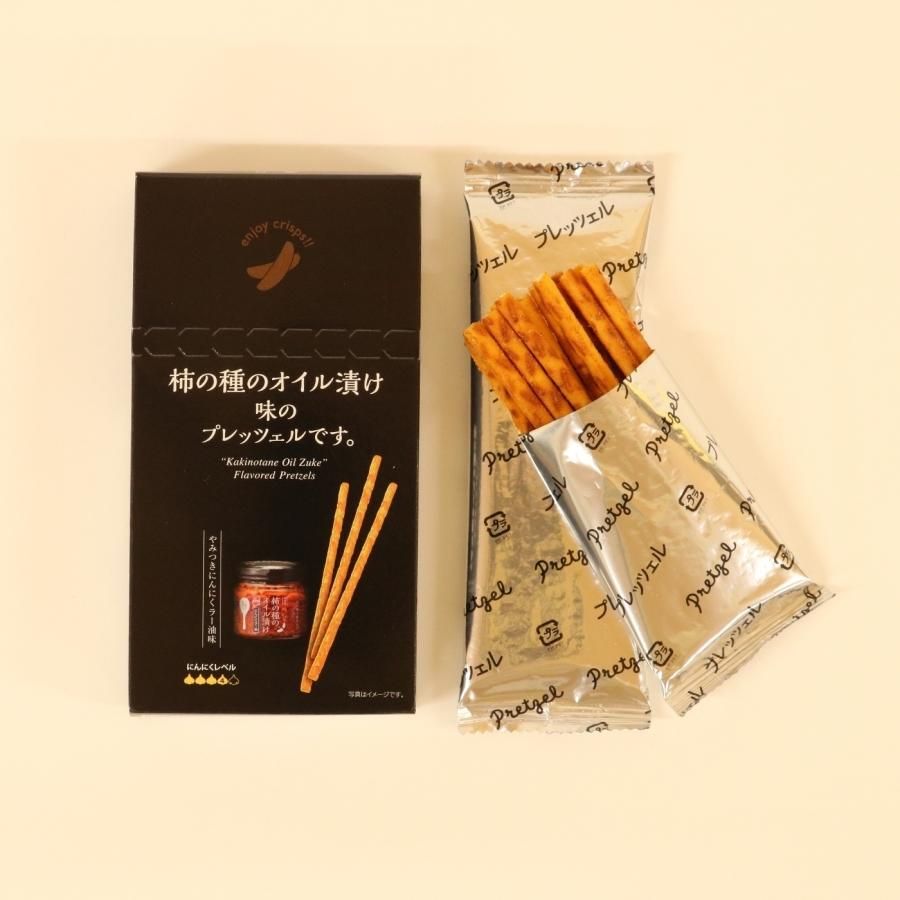 セット内容 柿の種のオイル漬け にんにくラー油1個、柿の種のオイル漬け だし醤油仕立て1個、柿の種のオイル漬け味のプレッツェルです。1箱