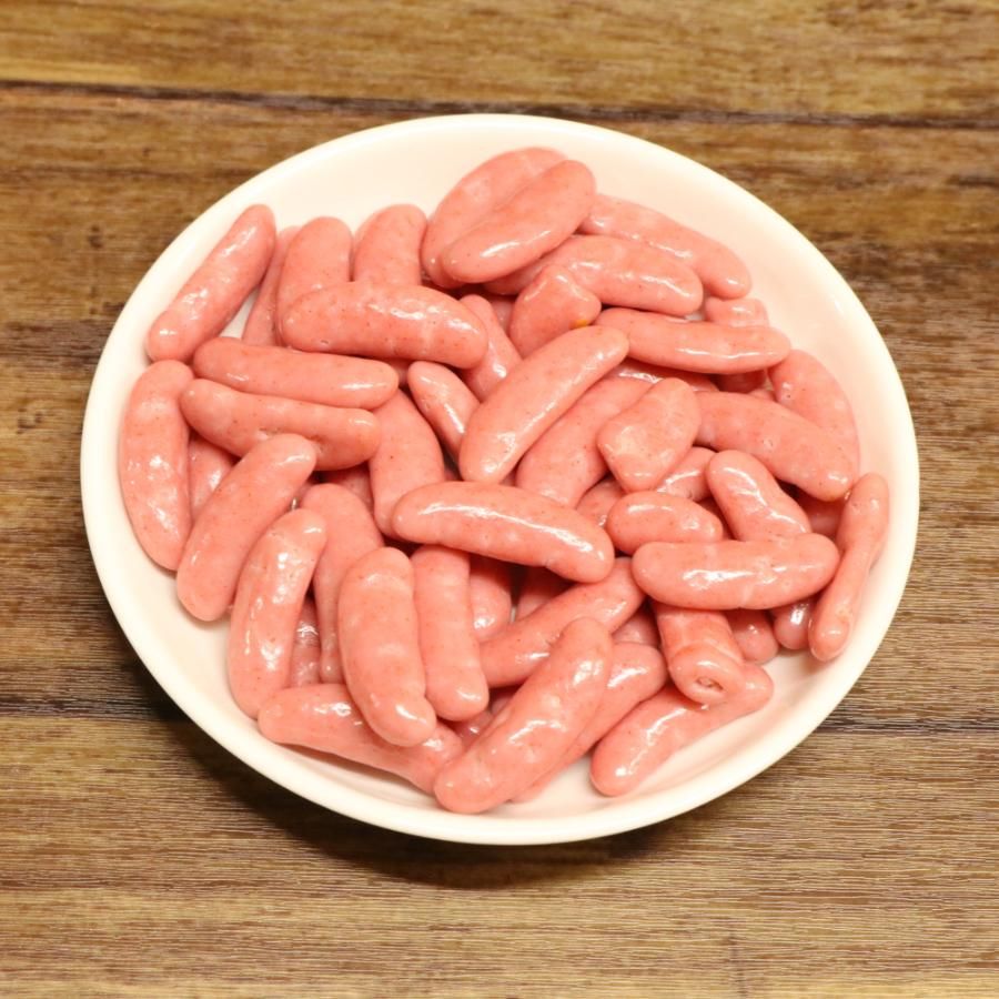 原材料名準チョコレート(植物油脂、砂糖、乳糖、全粉乳、ココアバタ―、ストロベリーパウダー、水飴)(国内製造)、でん粉、米(国産)、醤油、砂糖、唐辛子/乳化剤、酸味料、香料、光沢剤、着色料(紅麹)(一部に小麦・乳成分・大豆を含む)