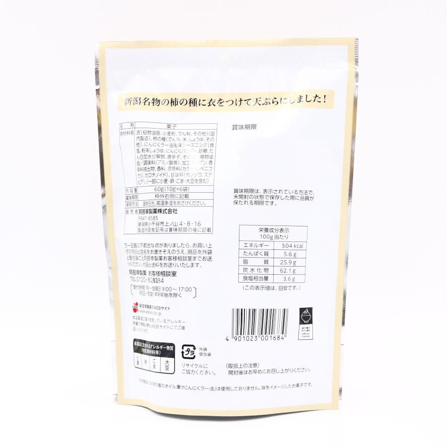 原材料名 | 衣(植物油脂、小麦粉、でん粉、その他)(国内製造)、柿の種(でん粉、米、しょうゆ、その他)、にんにくラー油風味シーズニング(食塩、粉末しょうゆ、にんにくパウダー、砂糖、たん白加水分解物、唐辛子、その他)、植物油脂/調味料(アミノ酸等)、加工デンプン、香辛料抽出物、香料、着色料(カラメル、ベニコウジ、カロチノイド)、甘味料(カンゾウ、ステビア)、(一部に小麦・卵・ごま・大豆を含む) |